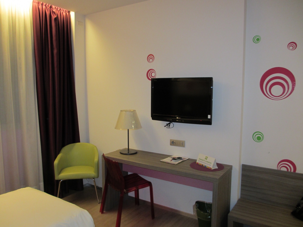 マルコポーロ空港からは近いようですが、目の前には高架橋が見える程度、裏側はアパート等の建物が見える程度で周りには何もありませんでした。ホテルの敷地から外への出方がわからず周囲の散策はできず。ホテル自体は新しいのかとてもきれい。ロビーやレストランの柱の色使いがカラフルでとってもポップなデザインです。ロビーの一角にお子様の遊ぶスペースらしき場所あり。PCスペースがあり3台設置されていましたが朝も夜も「使用時間外」の表示がされたままでした。客室ですが、とてもきれいで広さは十分。バスルームもとても広いのに、バスタブ無しでした。ドライヤー、冷蔵庫あり。朝食は7:00~とのことでしたが、過ぎても始まる気配なし…少し過ぎてやっと入れてもらえました。品ぞろえはまずまずでした。