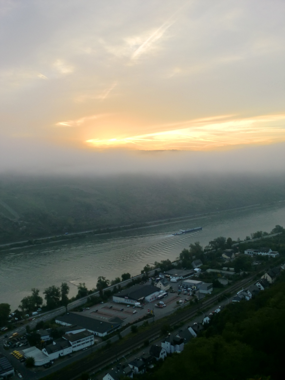 テラスから見える、朝靄のライン川