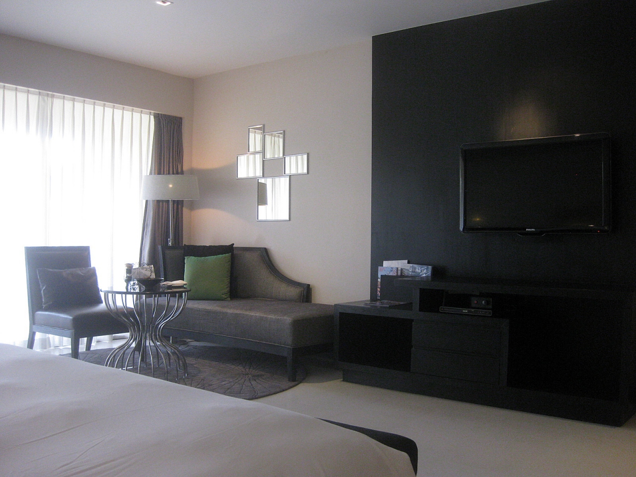 チェンマイからグリーンバスでチェンライ第1ターミナル(旧ターミナル)へ、そこから青い小さなソンテウのような車に乗って80THBでホテルに到着です。グランドデラックスというカテゴリーの部屋で、室内だけで50平方メートル以上はありそうです。客室内のデザインは今風のデザイン系高級ビジネスホテルですが、外のバルコニーには椅子とテーブル、さらにデイベッドが設えてあり、そこだけはリゾート風です。目の前はプールと広い芝生、そしてラグーン。すぐ横にはコック川も見ることができます。金・土曜は宿泊客が多かったのですが、日曜日は一日中シーンと静まり返っていました。静かに過ごすのにはもってこいのリゾートです。街の中心部にあるタイ航空オフィス前までと、新しくできたセントラルプラザへの無料送迎シャトルがありますが予約が必要です。私はゲーン・ハンレーが美味しいと評判のレストランに行くためにシャトルを利用し、店の前で降ろしてもらいました。シャトルの通り道であれば、途中での下車はもちろん、予約しておけば乗車も可能だということです。ビュッフェ・レストランでの朝食は一般的なものでしたが、イタリアン・レストランでの夕食は美味しく、サービスも大変に良いものでした。日本人の姿は少ないですが、スタッフは親切で有能な方が多いように見受けられましたので、安心して利用できるホテルだと感じました。ちなみに、街の中心からホテルまではトゥクトゥクで100THBでした。チェンライにゆっくり身体を休めに行くのであれば大変に良いホテルです。