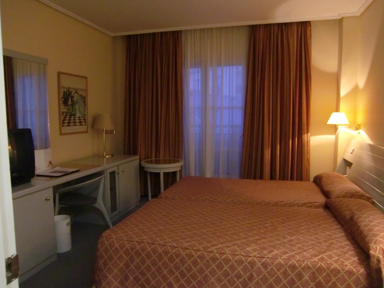 スペインのセビリアにある「ホテルTRHアルコラ」外観は横長でとても大きい。しかし、入口入ってすぐにフロントが中地下(1階)。エレベーター乗るにはフロント階か2階まで階段を移動せざるを得ない作り。ホテルが広すぎて客室までたどり着くのが一苦労。外観と違って客室、バスタブ等は狭い。徒歩5分圏内にカルフールあり。