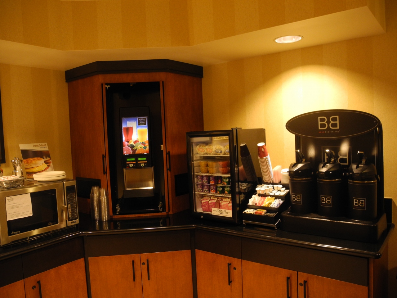 サンフランシスコ マリオット マーキース では、朝ご飯のサービスが付いていて、ハンバーガーやマフィン、更には、オレンジジュース等、ビュフェスタイルとなっています。好きなものをぜひ、食べてみてください。暖かい本場のコーヒをどうぞ。