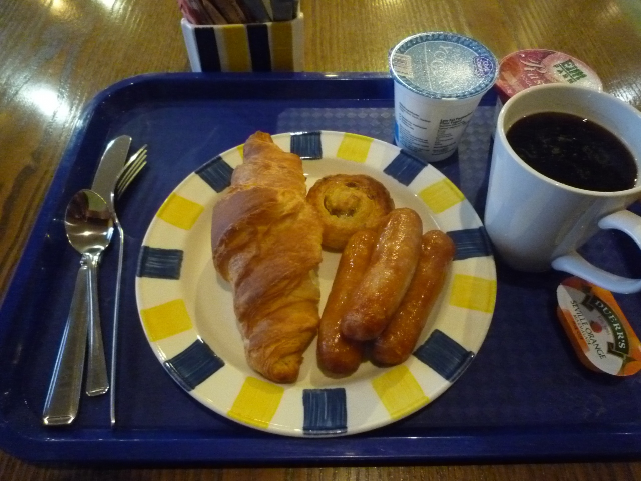 ホリディイン では、朝、宿泊者向けにブッフェスタイルの朝食サービスを行っています。ウインナーやクロワッサン等のパン、そしてヨーグルト等が有って、コーヒと一緒に食べる事をおすすめです。ぜひ、一度、行ってみてください