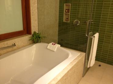バスルームは、シャワーブースが別で湯船からは外が見えるようになっていました。