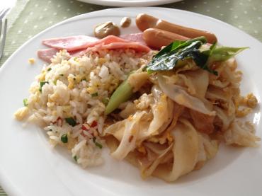 朝食のバッフェは、種類も豊富で麺類やエッグブースもあります。