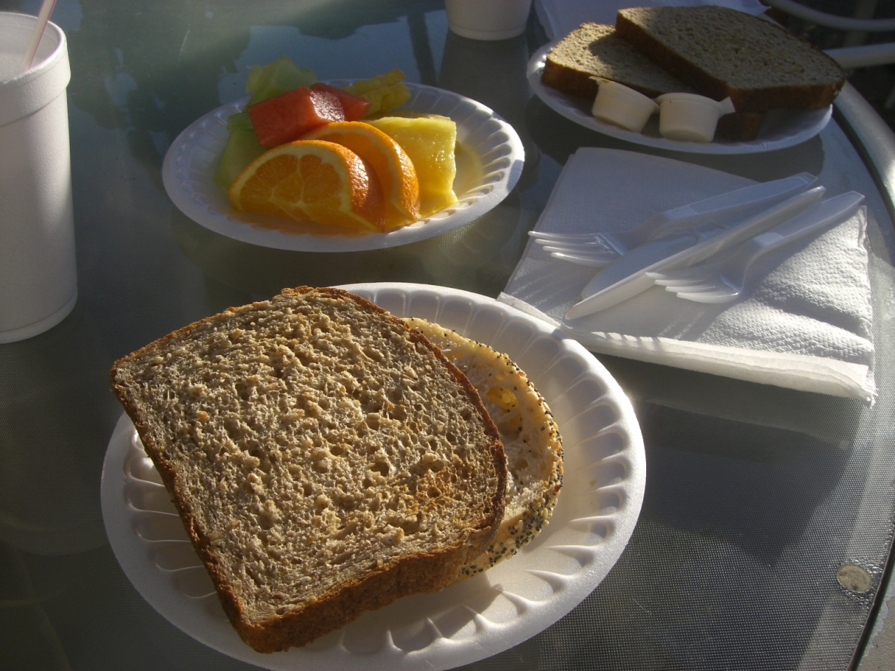 朝食も付いており、パンやフルーツ、コーヒー ジュース ミルク ココアなどあります。