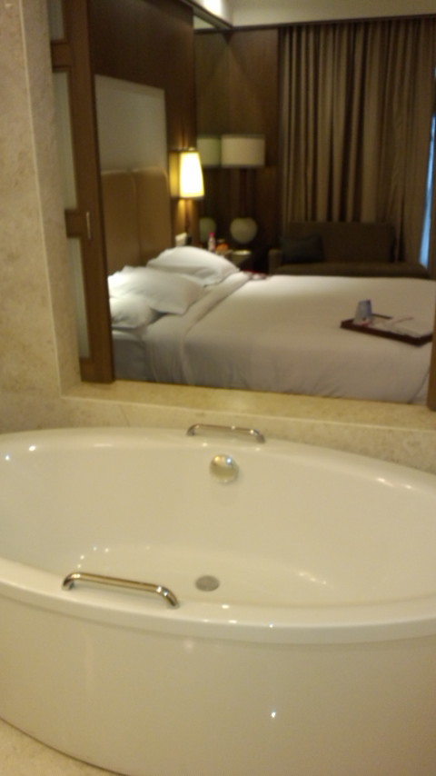 客室、バスルームともに綺麗で、必要なものは揃っています。バスルームにはバスタブもあり、案外豪華なイメージです。到着したときにウェルカムドリンクが出ました。ロビー階と上階にもレストランはあるのですが、選択肢はそれほどありません。ワインが少なかったのが残念です。