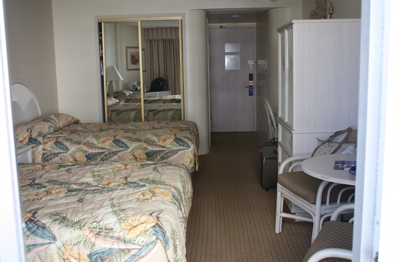 親戚の結婚式に参加するため夫婦でのハワイでした。ということで別に海が見えなくても便利のいいところ・安価でも評価の良いところという条件で検索したところこちらがヒットしました。海までは数ブロック徒歩5分、バス停は交差点を越えたところにあり移動にも楽でした。部屋のサイズも洗面所もそれなりであり不満はありませんでした。たぶん海へ行くときの小物入れ用だと思うのですがナップザックをいただきました。今でも重宝しています。個人手配の飛行機だったので、11時前にはホテルに着いてしまったので荷物だけ預けてでかようと思っていたのですが、すでに清掃が終わっていたようでそのまま部屋にチェックインさせてくれました。