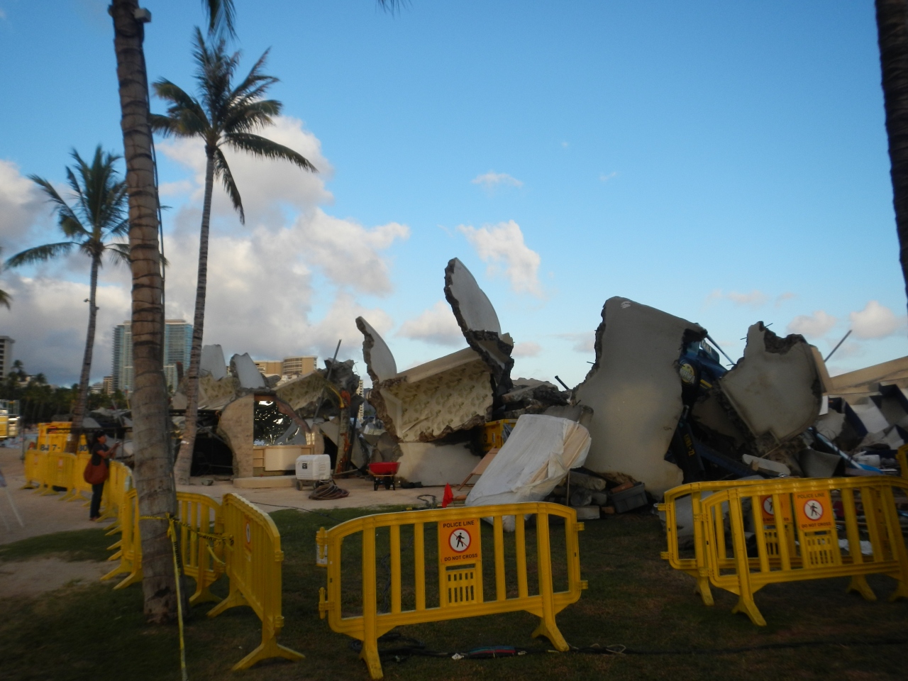 ヒルトンラグーンとビーチの間に、難破船やヘリコプター、建物の残骸がかたまっており、傍には大型クレーンが3台並んでいました。