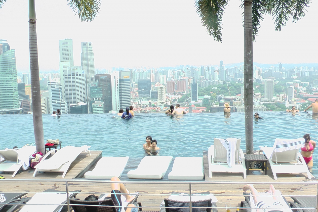 3つのホテルが57階でつながっていて、そこに、ボートの形のプールがあります。プールに入っていると、そこがボートとは、感じられません。二重の安全壁のようなものがあり、プールから真下を見ることはできません。見れなくて良かったです。ジャグジーも何か所もあり、寒くなると利用していました。日本のようなきめ細かなサービスは無いですね。例えば、着替えはトイレでした。カジノにも直結していましたが、21歳以上ということで、中学生の子連れは入場できませんでした。シンガポールは、とにかく高かった。。