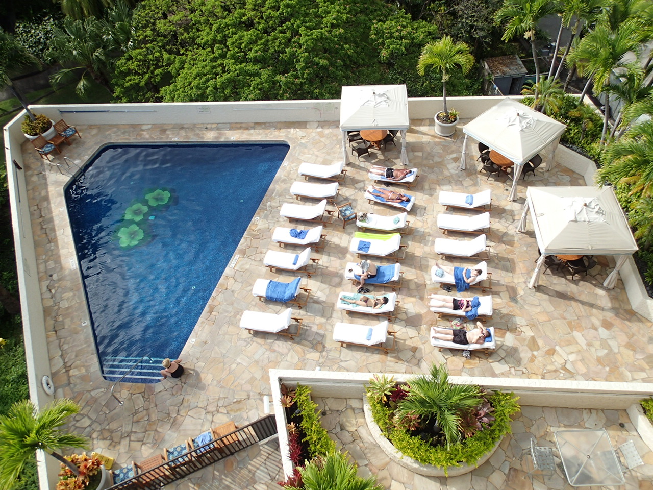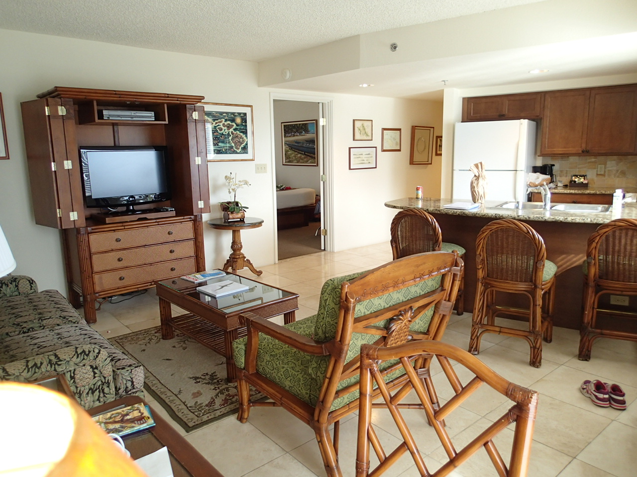 ゴールデンウィークの後半に、1ベッドルーム・デラックス・オーシャンビューに6泊しました。フルキッチンがあり、リビングがある、いわゆるコンドミニアムタイプの広い部屋です。ワイキキの西側入口に位置し、フォート・デ・ルッシーに隣接するロケーションは、さえぎる建物がなく開放的。ビーチフロントとはまた違った緑を見おろす景観は、のんびりくつろげます。滞在中はレンタカーを利用しましたが、トロリーやザ・バスの停留所も近いので便利だし、歩いてもロイヤルハワイアンセンターへは5分程度。何不自由ない立地です。公園をぶらぶら歩いて抜ければ、ビーチもすぐ。隣りのホテルの目線を気にするラナイより、目の前にヒルトンの花火がドーンとあがる“別荘気分”のラナイも、いいものですよ。