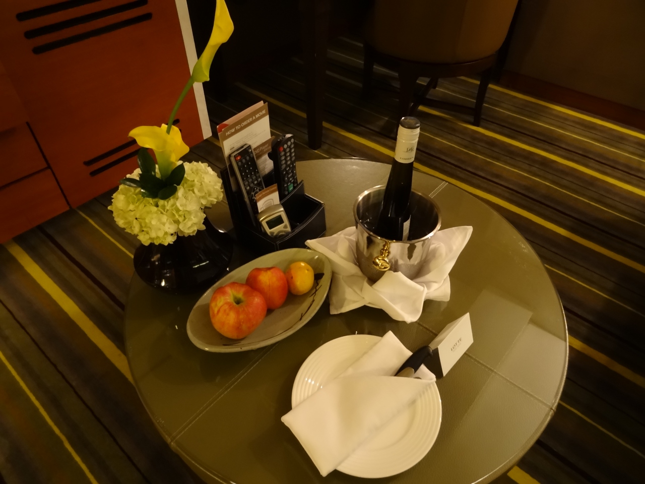 ウエルカムフルーツとワインが置いてあって、ウキウキ。