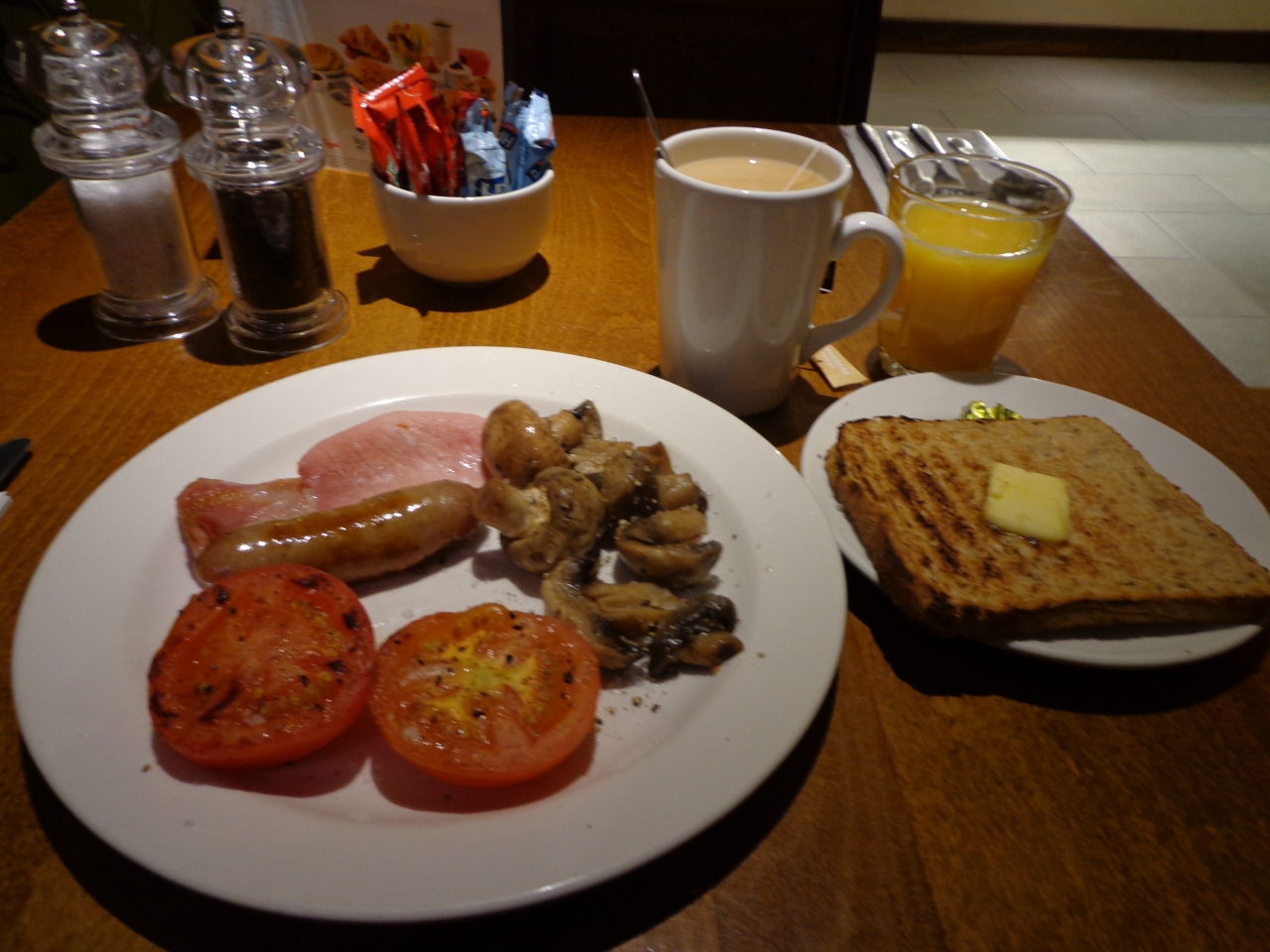 朝食はビュッフェ式です。種類は少ないですが、イングリッシュブレックファストを構成するものは全て揃っていました。これまた贅沢に慣れている人には物足りないかもしれませんが、庶民の私にはこれで十分でした。