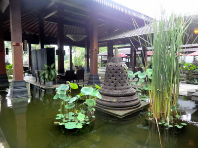 ホテルのコンセプトは「ボロブドゥール」で、庭の設置物や建物、小物の置物、庭園灯に至るまで、ボロブドゥール遺跡を模したデザインのしっとりした落ち着きのある庭で、とても素晴らしいです。