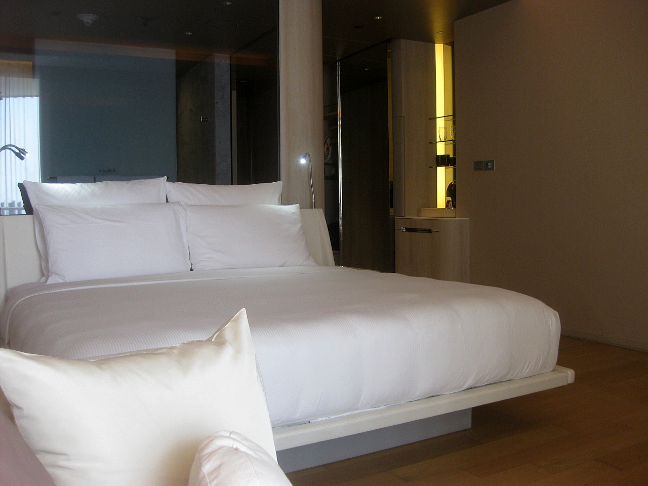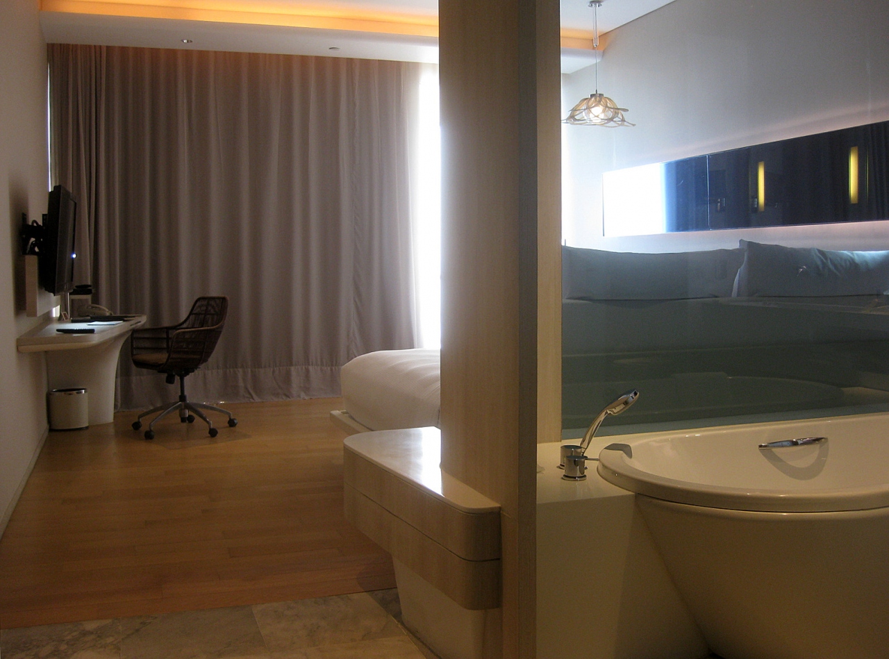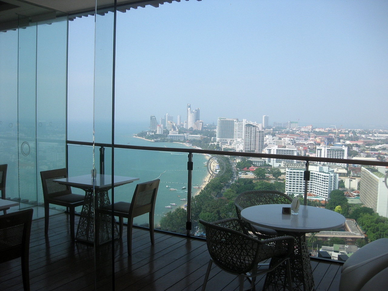 パタヤを訪れる観光客にとって最も便利な場所ともいえるビーチロードの中程、大型ショッピングモールの「セントラル・フェスティバル」上層階に位置するのが「ヒルトン・パタヤ」です。前回のエグゼクティブ・デラックスプラスルームは本当に素晴らしい客室でしたが、やはり料金的に…ということで、今回はエグゼクティブ・デラックスルームです。客室は白木とブルーを基調にしたリゾートらしい色使い。面積は46平米とのことですが、そんなに広くは感じませんでした。ただ一人であれば充分です。この客室の特徴は、窓側に向いたベッドの頭越しにバスルームがある点です。バルコニーはありますが、まさに猫の額で、デラックスプラスルームを知っているだけに、ちょっと凹みます。ただバスルームにあるバスタブ正面にはテレビも付いており、優雅なバスタイムが楽しめます。エグゼクティブ・ラウンジにはパタヤの風を感じられる屋外席もありますし、飲食関係も比較的充実していましたので、ホテル内でゆったり過ごすには良いと思います。