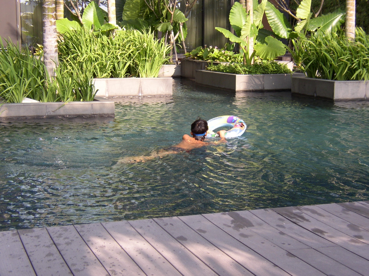 ビンタン島行きのフェリーに乗るために、シンガポールで前泊することになり、空港に近いこのホテルを選びました。子どもがプールで泳いでいましたが、入り組んだ水路のようなおもしろい形のプールで、楽しそうでした。ただ午前中は、冷たいです。