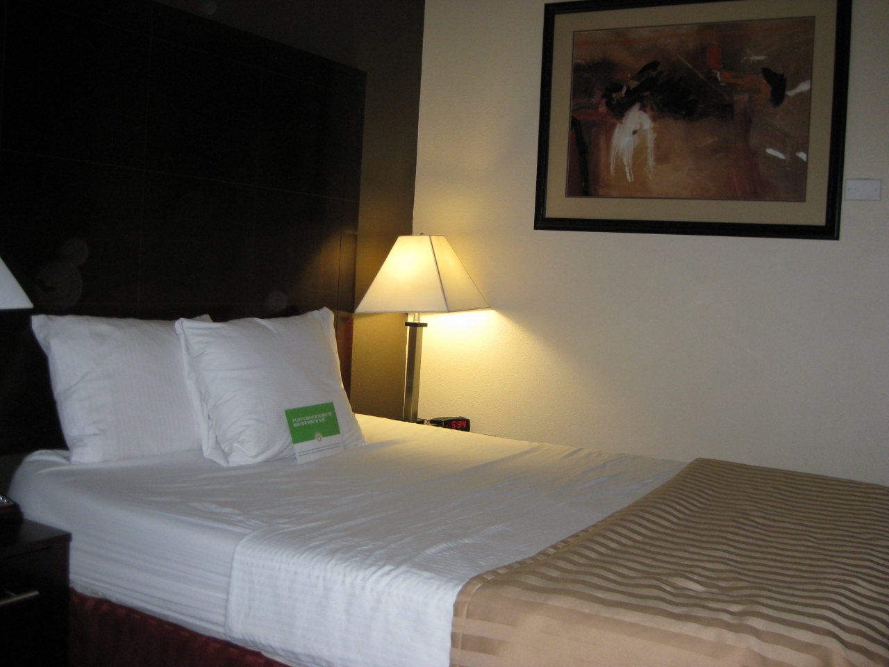 ホテルの設備は悪くない。私は早朝発のため食べなかったが、朝食もついている。環境はよいとはいえない。夜でも時々車が通る道路に面していてけっこううるさく、時差のせいもあって眠りが浅いので、すぐに目覚めてしまう。また、遅い到着の客も多く騒音をたてるので結局ほとんど眠れなかった。