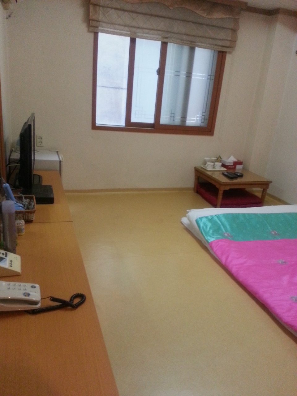部屋は至ってシンプル。電気ポット、1日1人1本配給される無料水が入った冷蔵庫、インスタントコーヒーの粉、ドライヤー、鏡、タオル、歯磨き粉、ボディーシャンプーや髪の毛のシャンプーと必要最低限のものはそろってます。