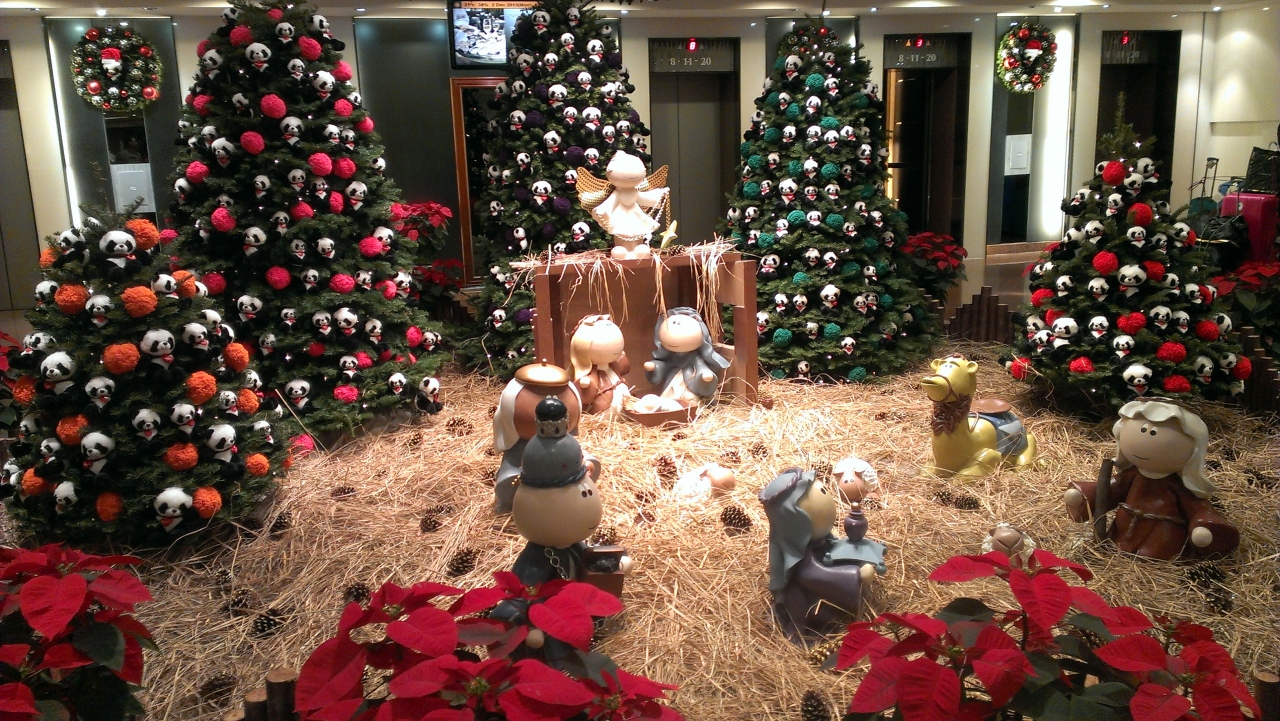決して度派手なツリーがあるわけでもないですが、狭いロビーにパンダのぬいぐるみをツリーに飾ったかわいらしいクリスマスデコレーションになってました。ハンパーを売るログハウスもパンダのぬいぐるみで飾られてます。
