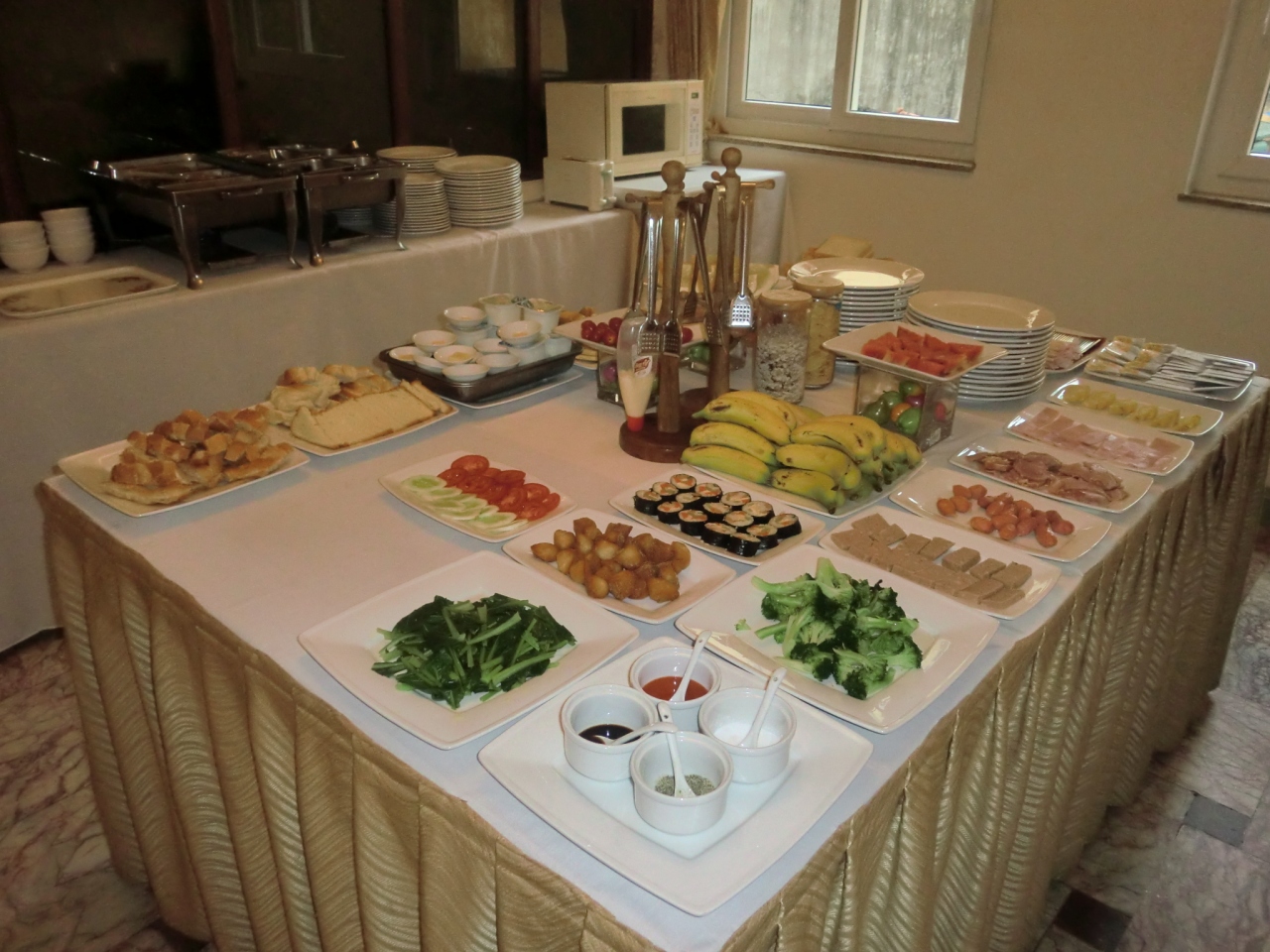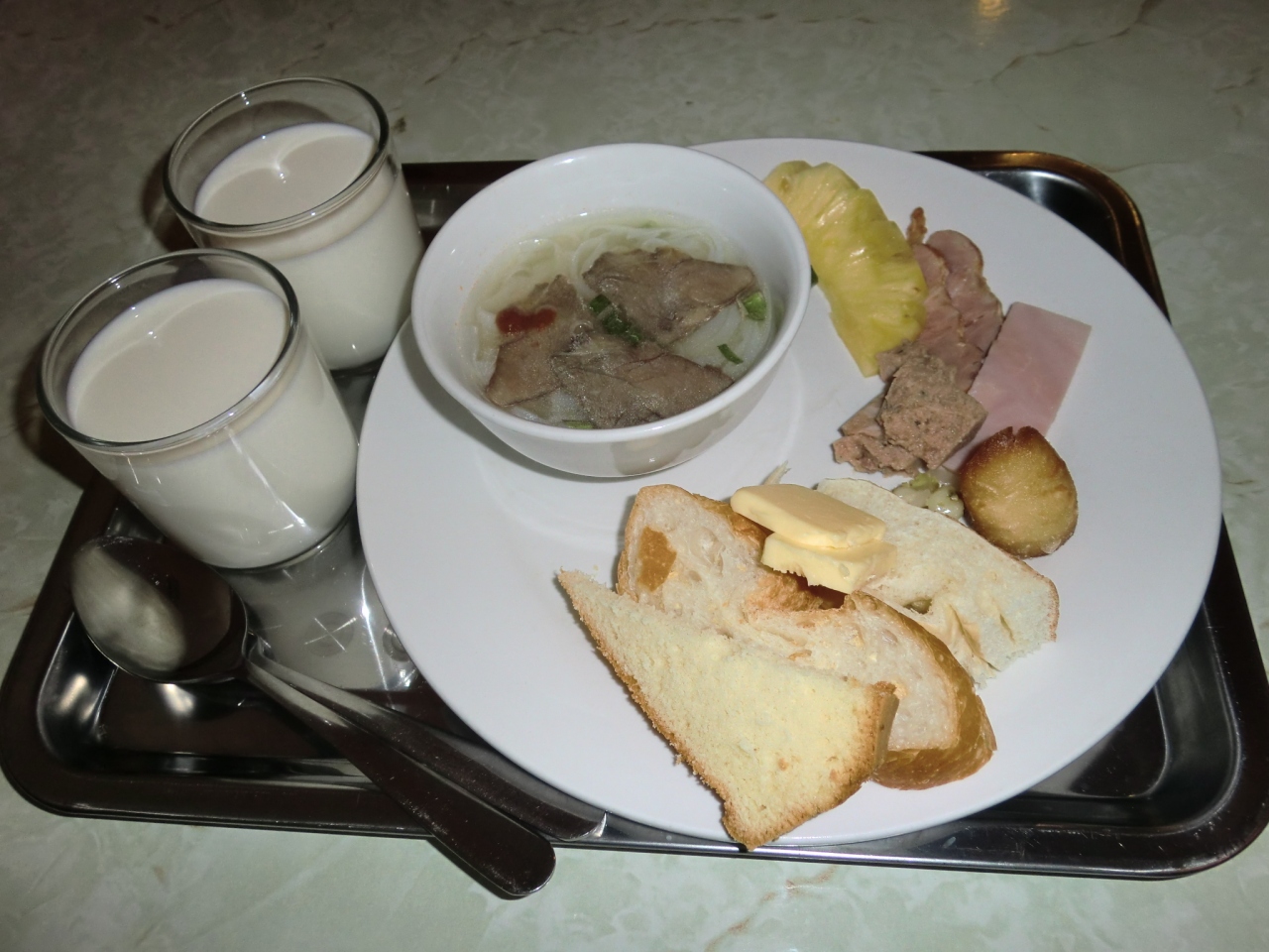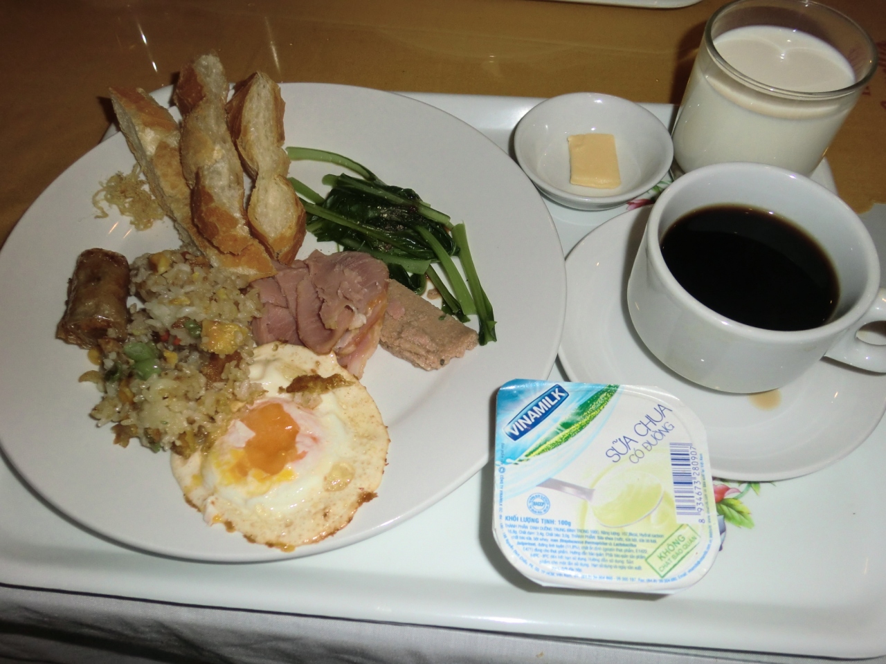 やはりフランス人客が多く、ダイニングルームでも「ボンジュール」って挨拶し合いました。そのダイニングルームは縦長で、一番奥にバッフェの品々が並んでいます。こちらも豪華な感じはしませんが、フォー有り、フランスパンなど(美味しい)も有り、焼きそばも有り、十分に満足出来ました。