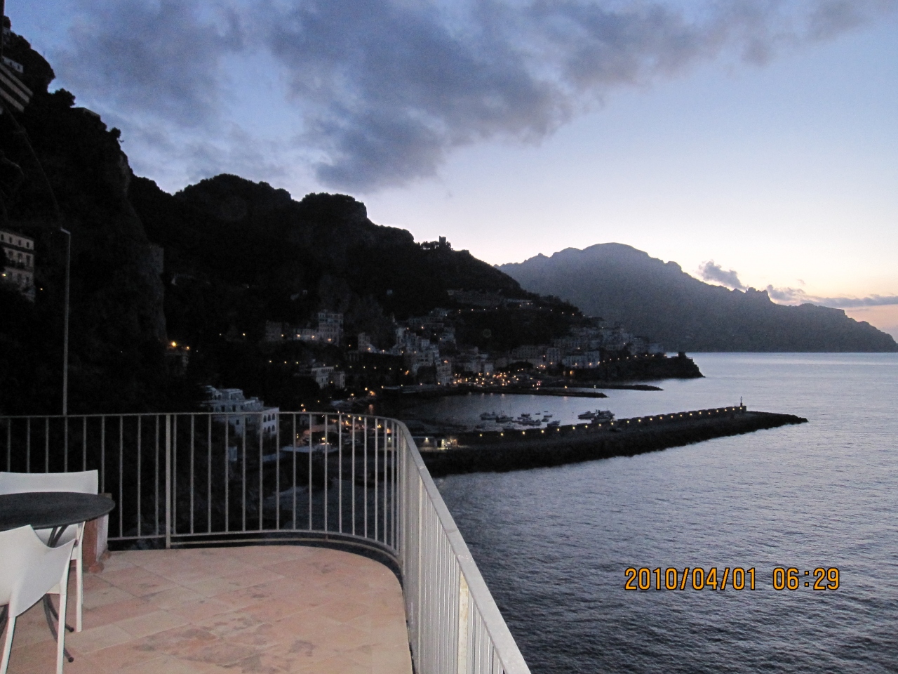 広めのバルコニーが付いていて、海が目の前にありますので日の出はとてもキレイにみえました。夜のロマンチックなアマルフィーの街もバルコニーから見ることができます。