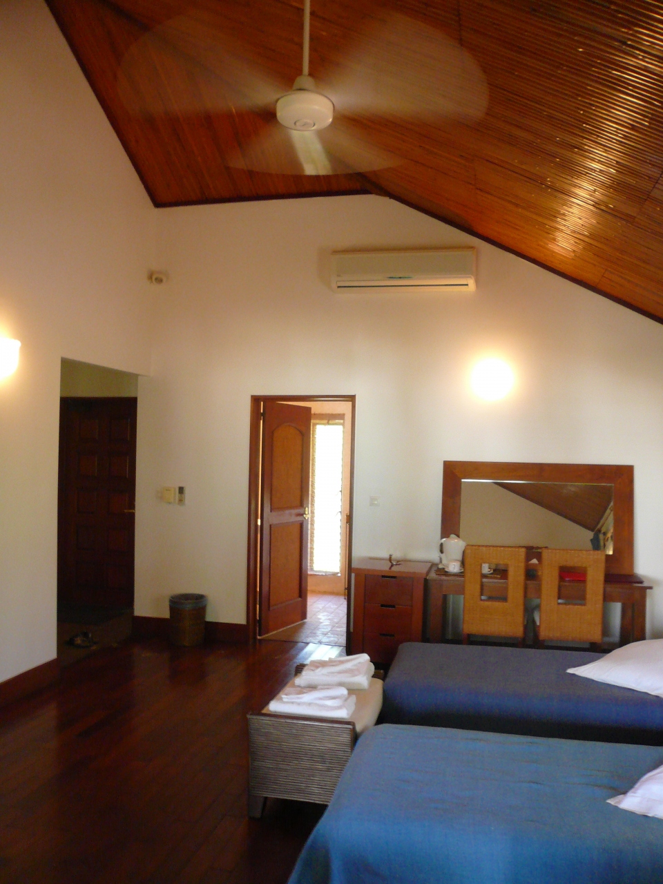 ホテル前のビーチの砂は小麦粉のようにさらさらふわふわで真っ白、見渡す限りの透明な海です。