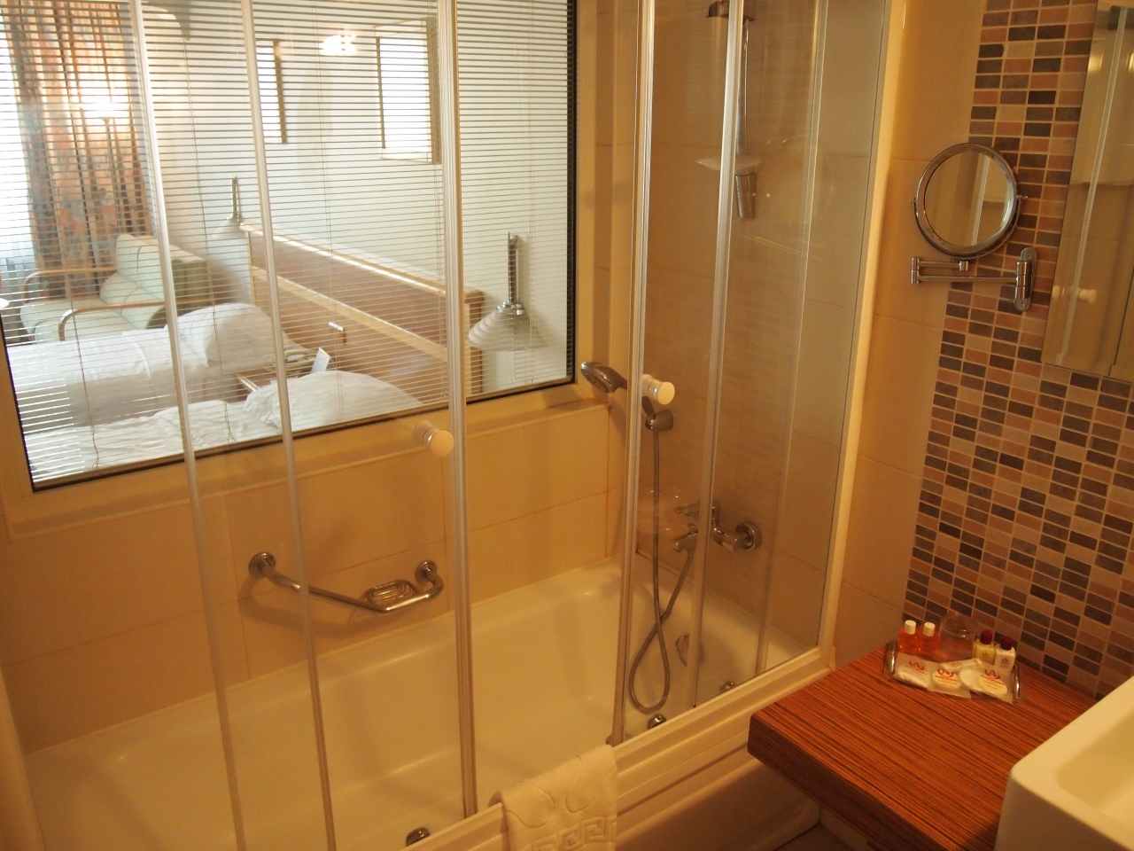 部屋はそれなりに広く使い勝手もいい。浴槽のあるタイプの部屋でした。窓からの景色は大通りに面したタイプと裏の丘が見えるタイプがあります。幹線道路沿いなので少しうるさいですが窓からモスクのライトアップが見られます。食事から戻ると鍵が空かなくなり、兄がカードキーを交換してもらいにいったりとアクシデントがありましたがそれなりに良いホテルだと思います。湯沸かしポットはありましたが、冷蔵庫があまり冷えませんでした。