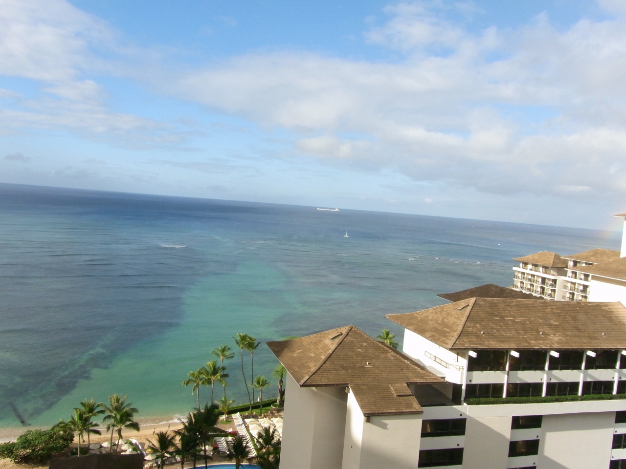 お部屋は高層階のデラックスオーシャンビューでしたが、立地上ハレクラニの向こうに海が見える感じでした。