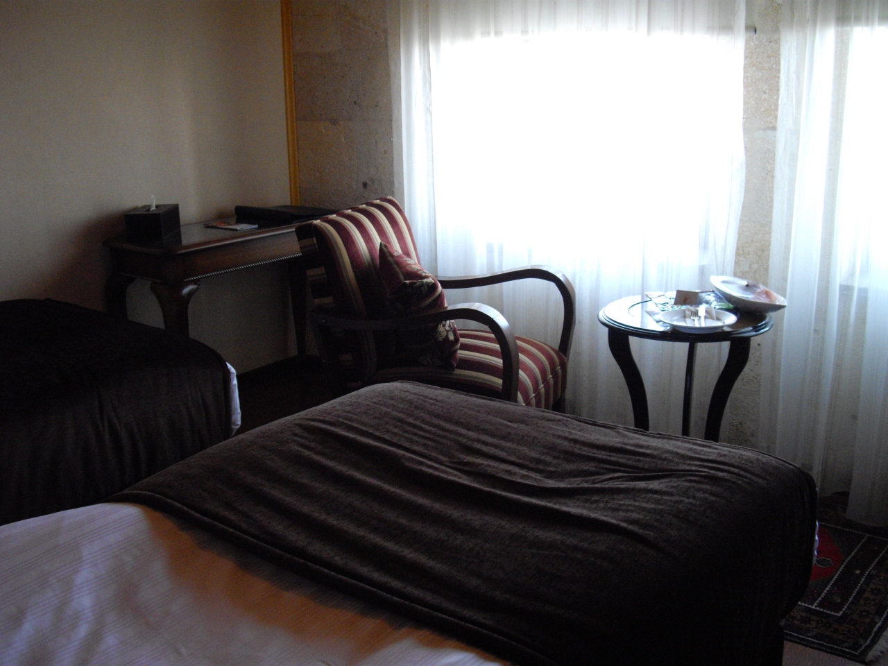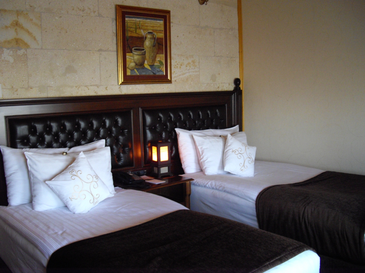 一つの建物がホテルになっているのではなく、斜面に沿っていくつもの客室が建っています。レストランやフロントも別棟です。部屋はそれぞれ広さも間取りも違います。私達が予約したスタンダードツインはとても狭かったです。別のサイトにそのようにクチコミを書き込んだらホテルから返信が来て、申し出てくれたら部屋を変えてくれたそうです。今後泊まられる方で部屋が狭いと感じたら、臆せずにルームチェンジの依頼をするといいと思います。ケイブホテルと言っても、私たちの部屋は洞窟を利用したものでなく、斜面に新たに建てたものでした。その為清潔で、バスルームも換気の悪い洞窟ホテルにありがちなカビ臭さは全くありませんでした。部屋は道路から階段を上がった2階部分にあったので、窓からの眺めは良かったです。時差ボケで朝早く目覚め、日の出のカッパドキアの光景を部屋から堪能しました。もちろん気球がたくさん飛ぶ光景も部屋から見ることができました。