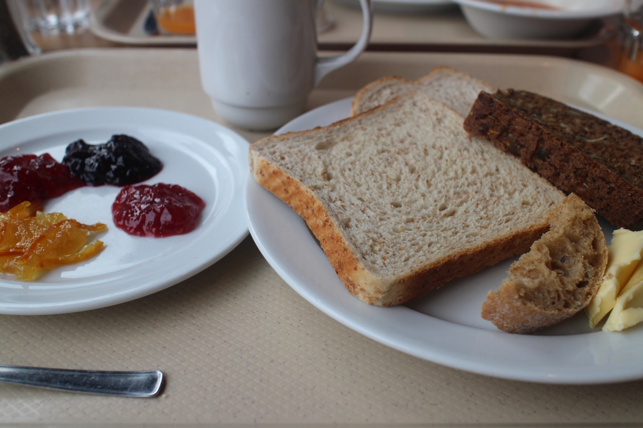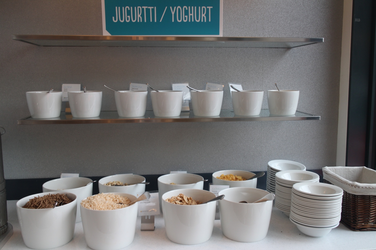朝食バイキングも、ハム、ヨーグルト、フルーツなど定番に加え、フィンランドらしく雑穀パン、ピーラッカ、シナモンロールもあり。