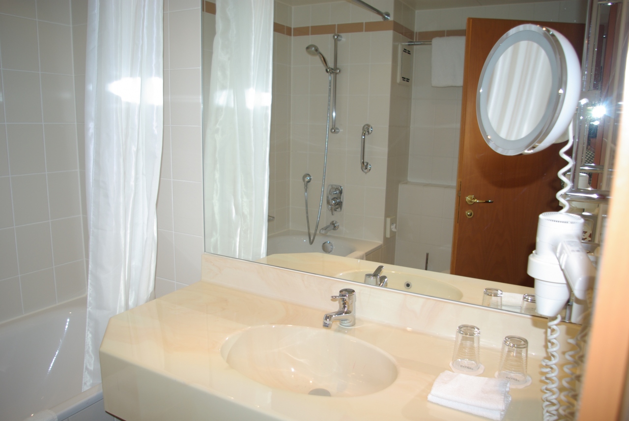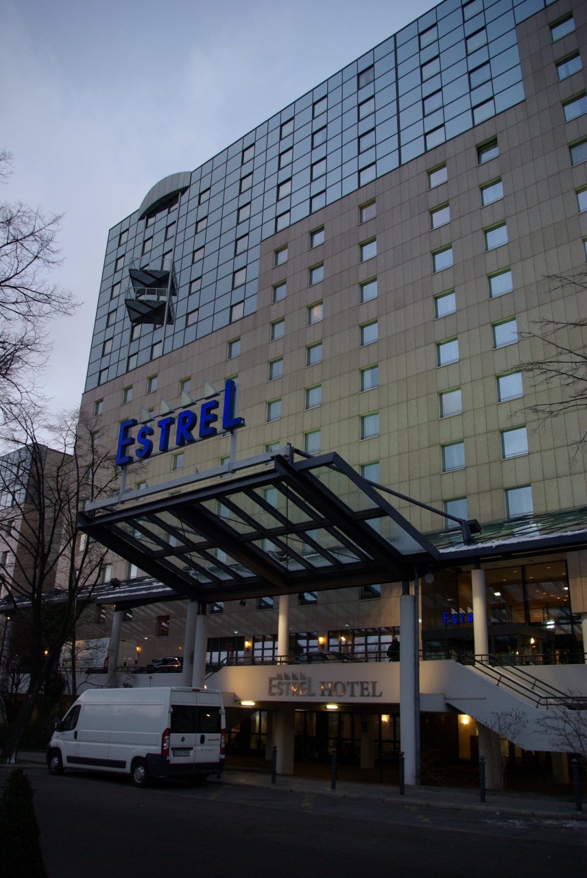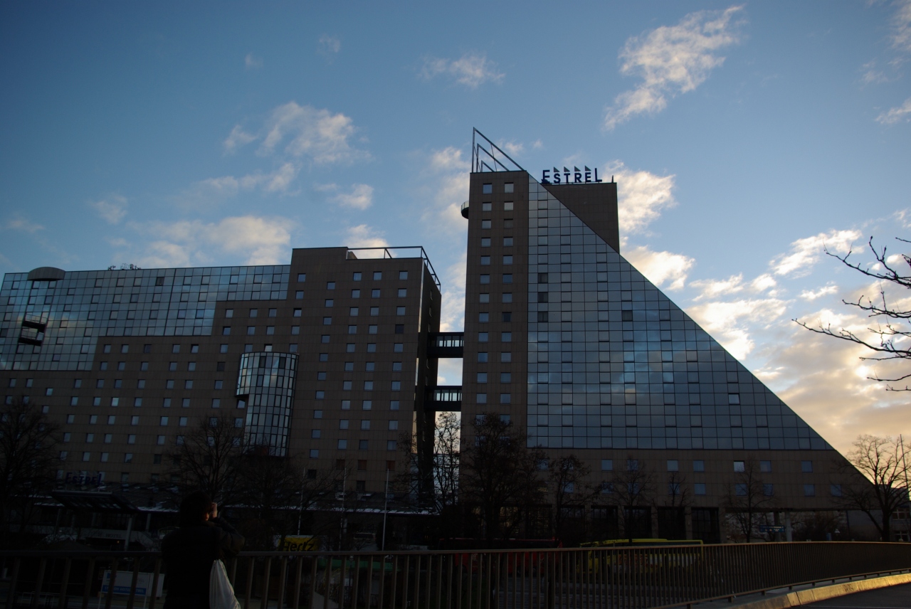 郊外ですが、Sバーン環状線のゾンネンアレーの駅が橋を渡ってすぐなのでたいへん便利です。部屋からも駅が見えます。建物は大きな三角定規のようで、近代的な大型ホテルです。駅のすぐ先に「Netto」というスーパーがあり、月曜から土曜の7~22時に営業しています。ほとんど地元の食料品と日用品を扱う店で、飲み物などを手に入れるのに便利です。