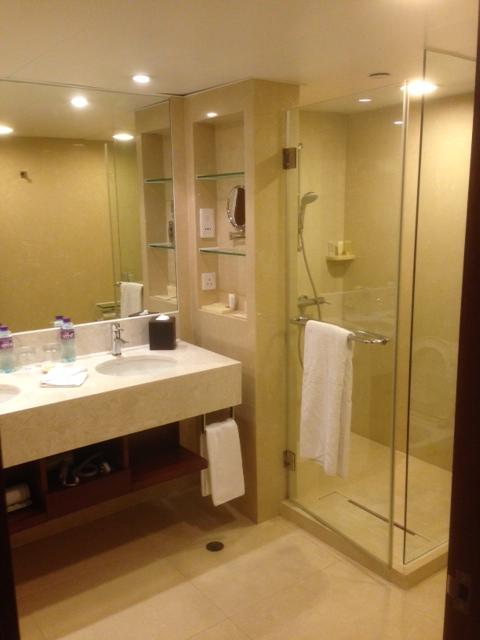 浴室はバスタブなしのタイプで、ガラス張りのシャワールームがありま、洗面台も広くアメニティも充実しています。