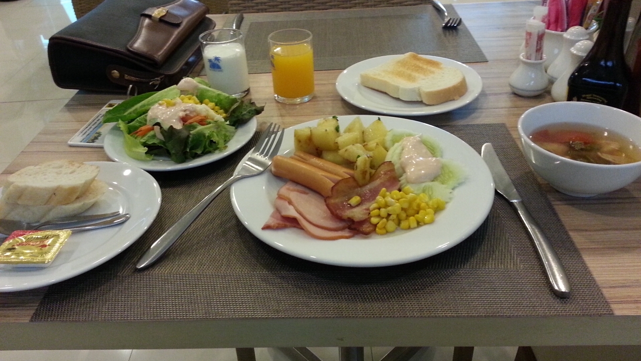 朝食はバイキング。まあまあ旨いが、ほとんど同じ料理なので、長距滞在には向かない。