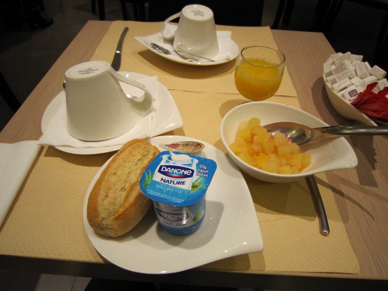 クロワッサン、バゲット、フレーク、ヨーグルト、フルーツポンチにオレンジジュースとコーヒーのみでした。(卵、ハムなどのホットメニューはなし)
