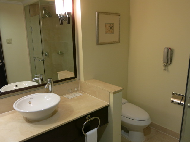 バスルームはスケスケのシャワールームと、日本のビジネスホテルによくあるような感じの風呂がありますが、バスタブの広さは日本よりだいぶ余裕があります。