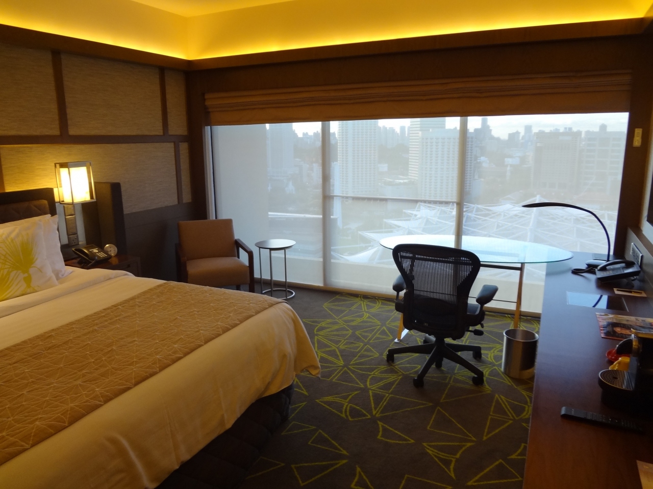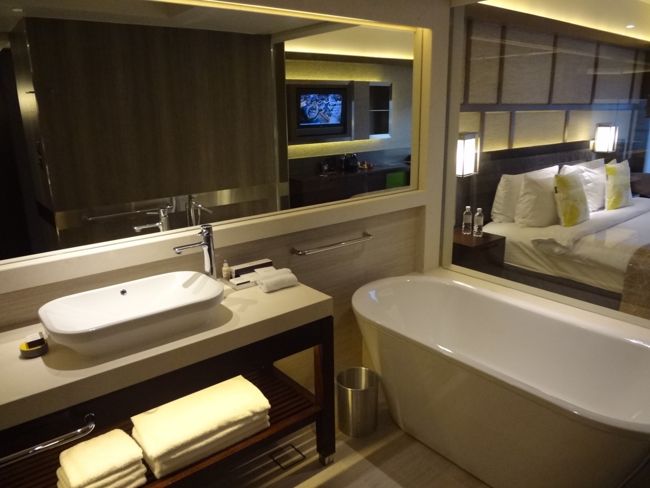 ショッピングモールに直結しているホテルだから夜の移動も全然問題ない。部屋もかなり広く作られている。浴槽と寝室がガラスで仕切られていて、テレビも見れるようになったている。これでもう少し安ければ申し分ないのに。