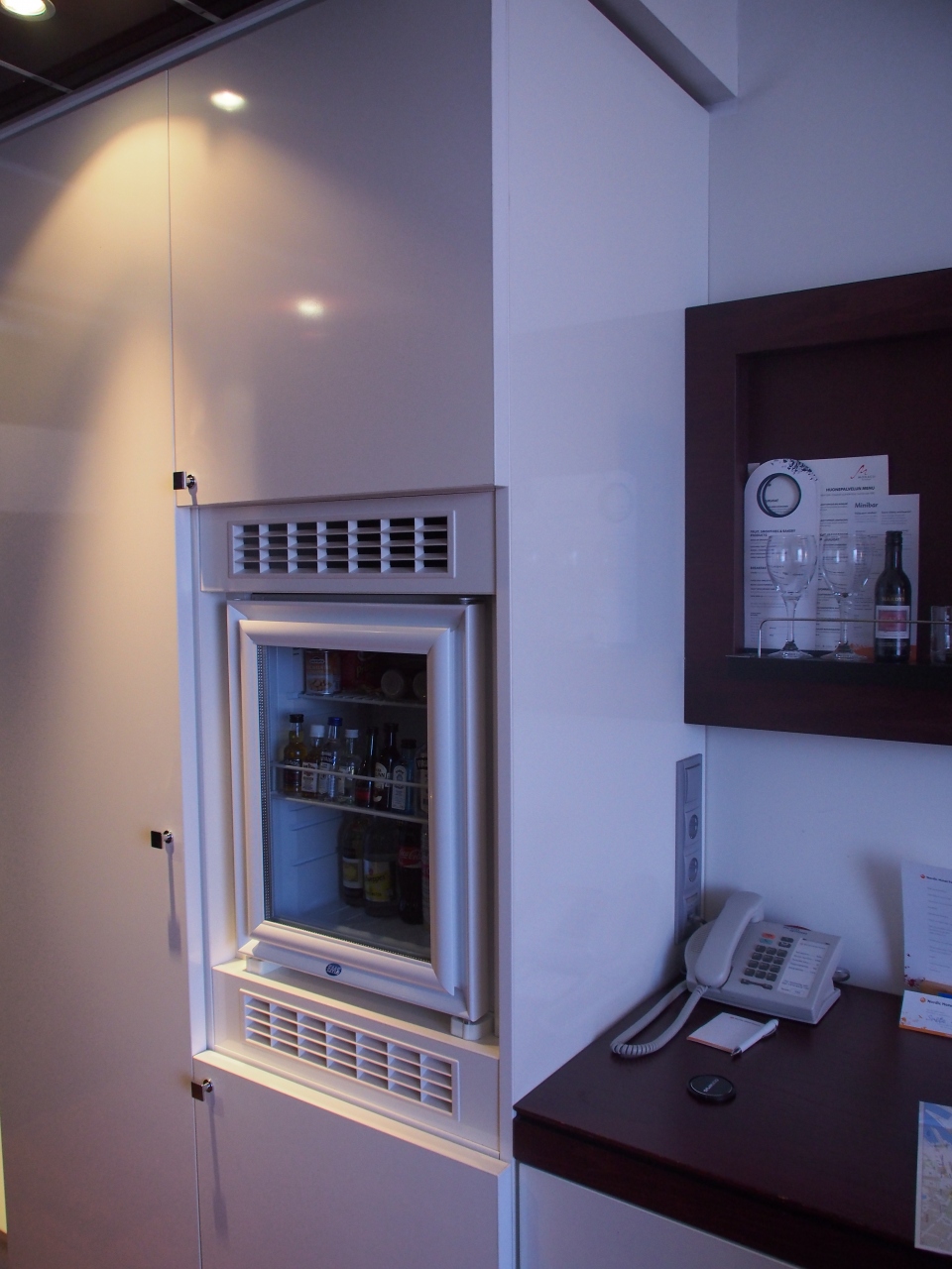 ホテルの客室はシンプルです。冷蔵庫が特徴的で