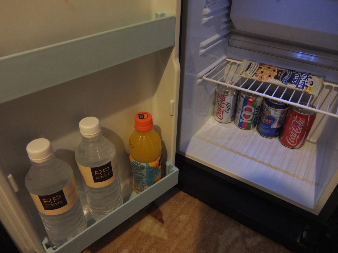 お部屋内の冷蔵庫に入っている飲み物とお菓子は無料で飲み放題で、