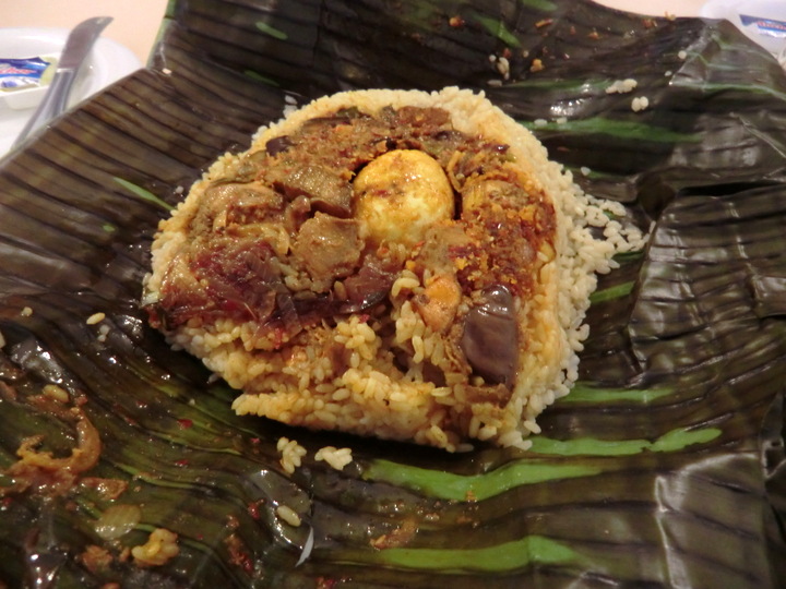 名物の「バナナの葉包みの炊き込みご飯」をいただきましたが、大きなバナナの葉に、ご飯とチキン、卵などをのせ、包んで炊いたもので美味しかったです。。