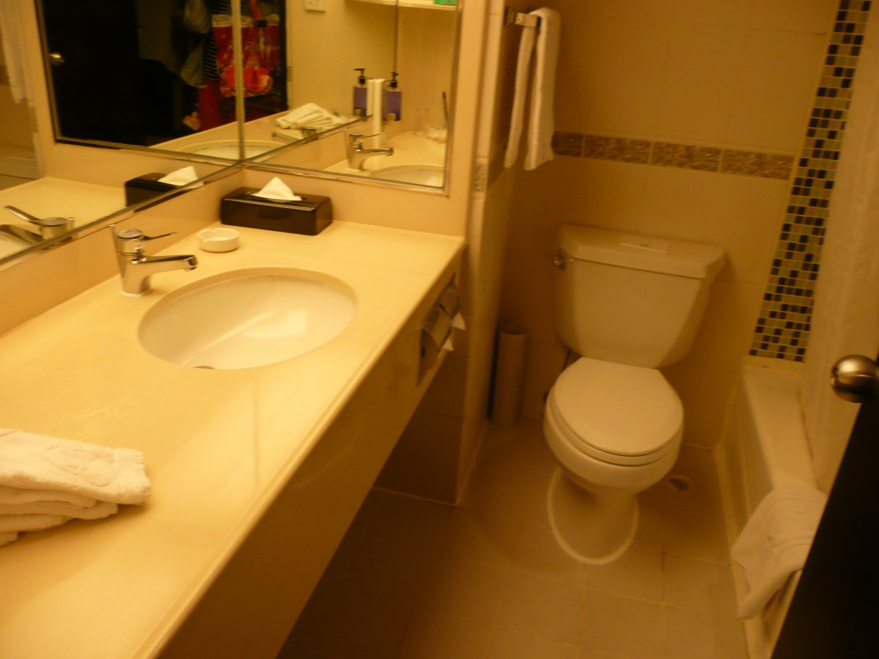 立地は悪いですが、尖沙咀まで約20分の無料シャトルバス(予約制)が出ており、不便さは感じませんでした。フロント横では、ピアノを弾いているパンダのぬいぐるみがお出迎えしてくれました。部屋は、全体的に綺麗ですが、バスルームに毛が落ちていたのと、エキストラベッドの軋みとがたつきがひどかったのは気になりました。