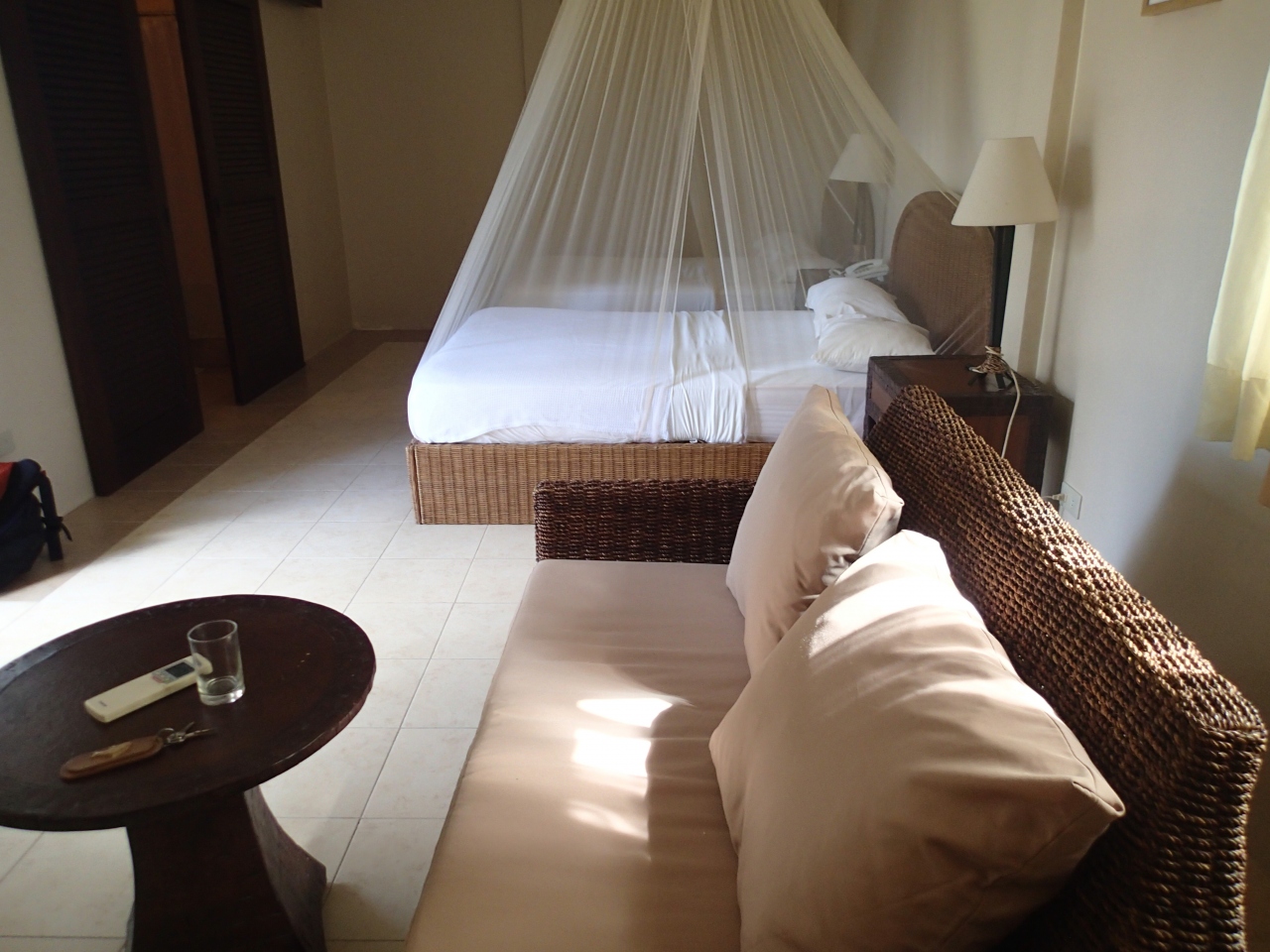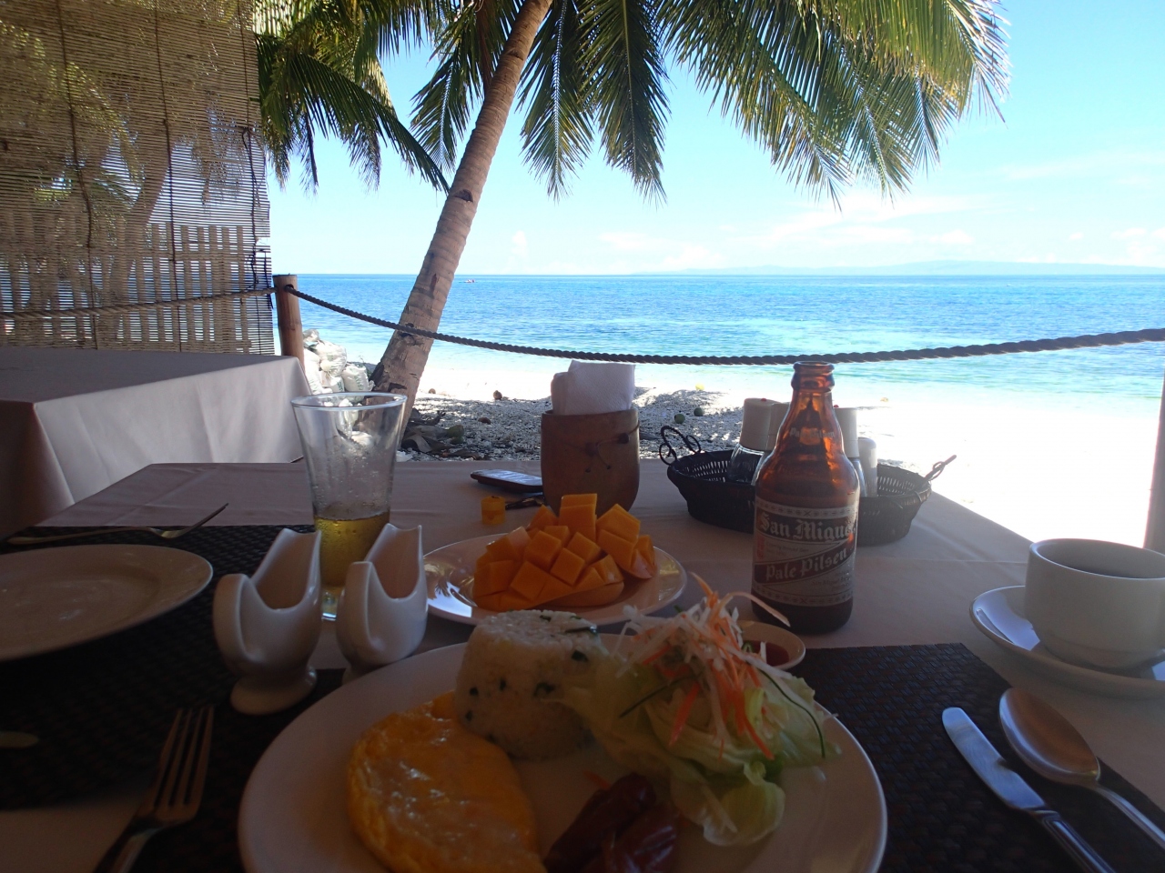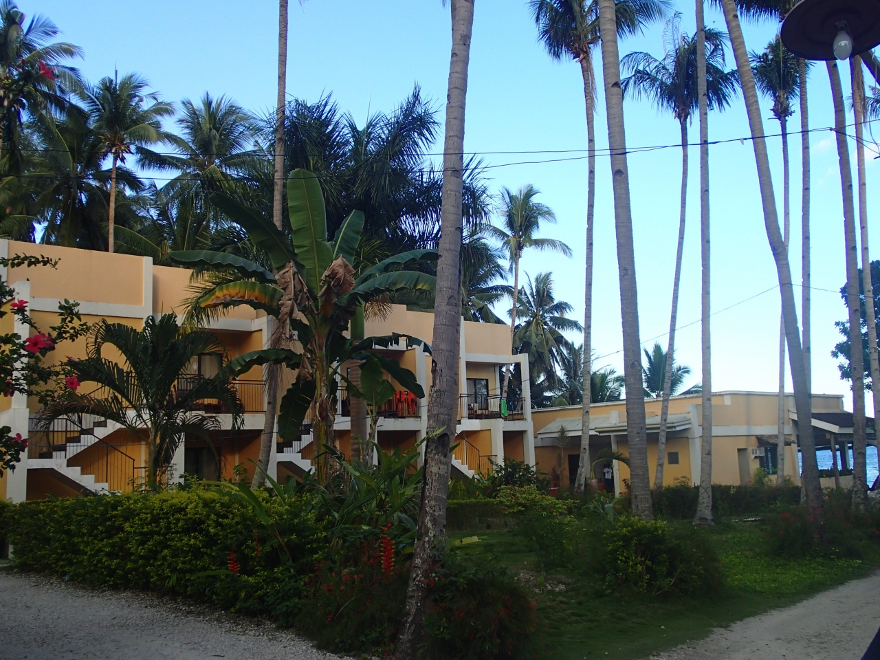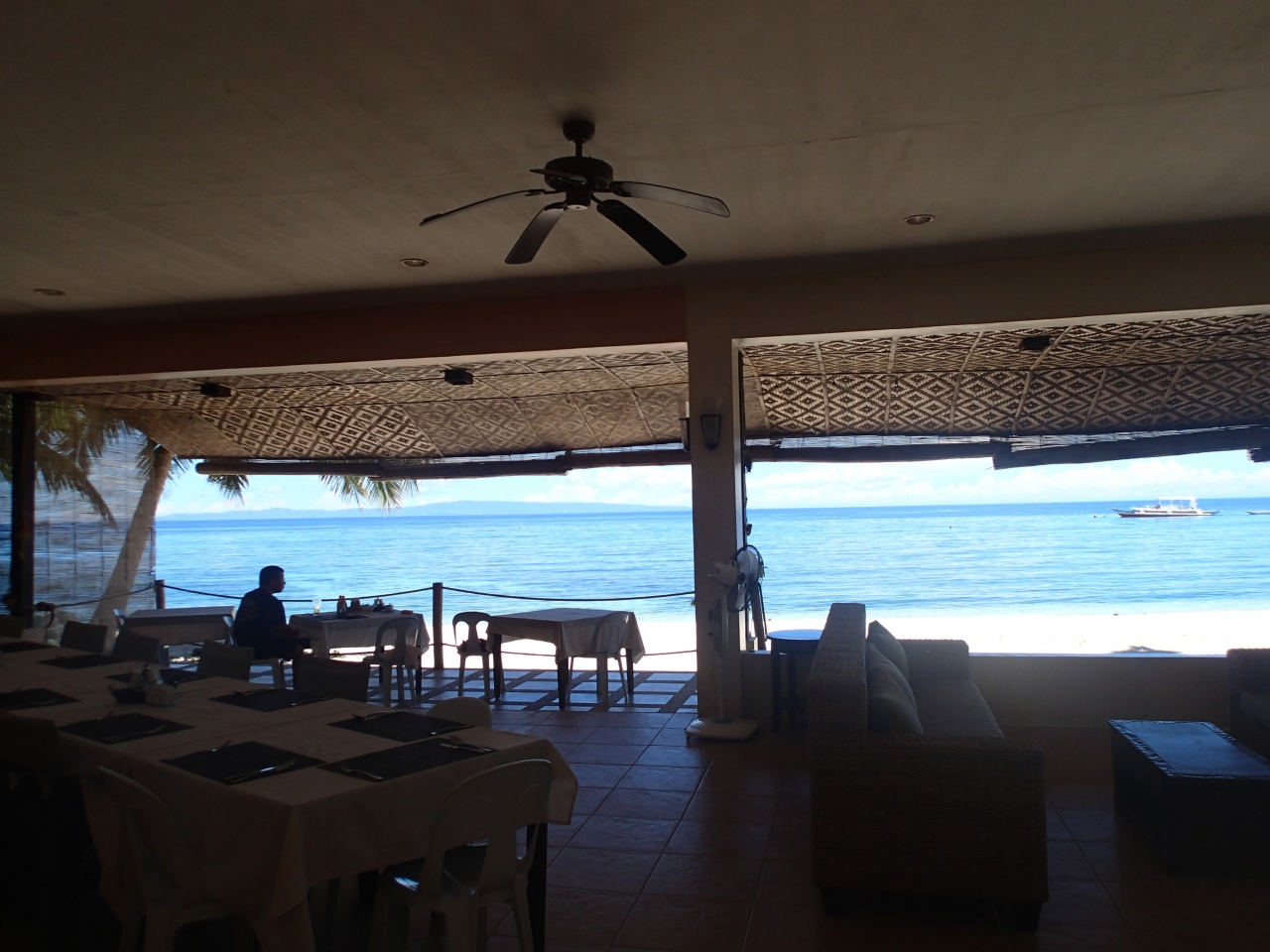 6部屋だけの小さなホテルです。部屋は広く、バスルームも広いです。水圧の良いお湯のシャワーを初めてフィリピンで浴びることが出来ました。ホテルから歩いて10分ほどで街に出られます。ローカルな小さなお店や露店が並んでいます。大きなスーパーやレストランはありません。ですから、食事はこのホテルでしか取れません。部屋からは海が臨めませんが、レストランはビーチ沿いにあり、海を眺めながら食事が取れます。早朝5:30~6:00にレストラン前の砂浜で行われるモーニングヨガ(P100)がお勧めです。