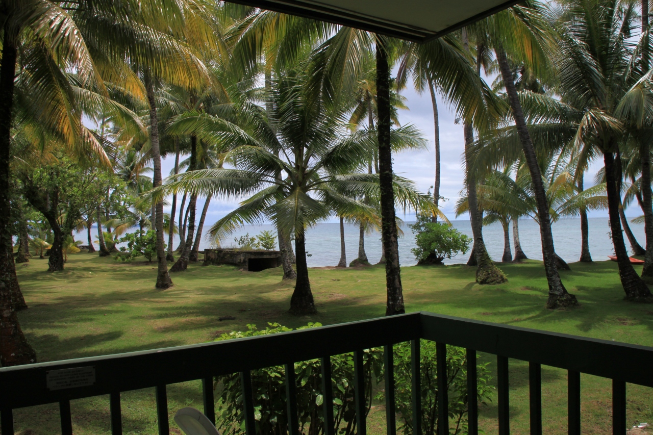 島の最南端の突端に位置して、西側の部屋はサンセット側、東側の部屋はサンライズ側と、全室オーシャンビュー。広い芝生とたくさんのヤシの木がリゾートホテルの雰囲気を醸し出しています。お部屋は少し広めのツインルーム。水回りは設備が古くタオルも古びていて、高級リゾートホテルのような雰囲気ではありません。ダイビングのベースとして利用する分には充分ですが。