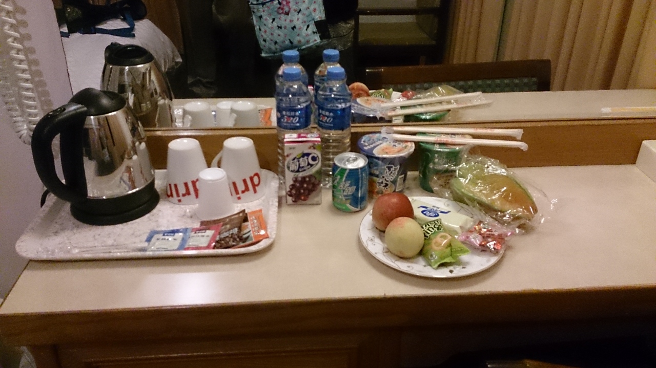 2014年5月9~12日 ツアーで利用しました。初日無料の水2本カップラーメン2個 お菓子 桃 リンゴ スターフルーツなどあり喜んで果物を食べ皮を捨てました