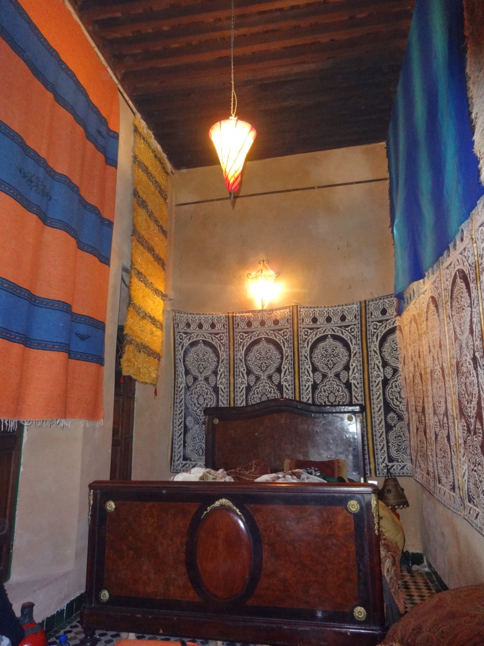 日本語での口コミがほとんどなく不安だったのですが、ダール内はかわいらしく装飾されており「これぞ女子が好むモロッコ!」といった感じです。案内された2階の客室内は古さはあるものの、それがまたいい味出してました。ふわっふわの毛布が用意されてて寝心地が良かったです。天井がめちゃめちゃ高く、クイーンサイズのベッドのほかにシーティングエリアもあり、十分な広さ。wifiもサクサク繋がりました。TVや冷蔵庫はありませんでした。ただ、ここに限ったことではありませんが、窓の外はパティオなので景色を楽しめないことと、照明が少し暗すぎたことが難点です。それもまたアラビアの夜っぽくていいのですが、書き物をすると目が疲れました。