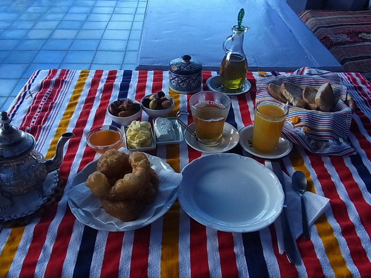 朝食は屋上のテラスで頂きました。一般的なモロッコの朝食でしたが、パンが特に美味しかったです。(揚げパン最高)