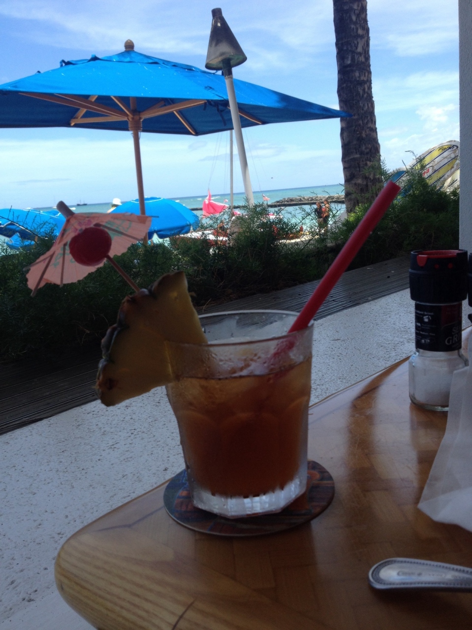 ビーチを望むハンバーガーレストランは、ランチの時間帯にはカクテルが4ドルとリーズナブル。