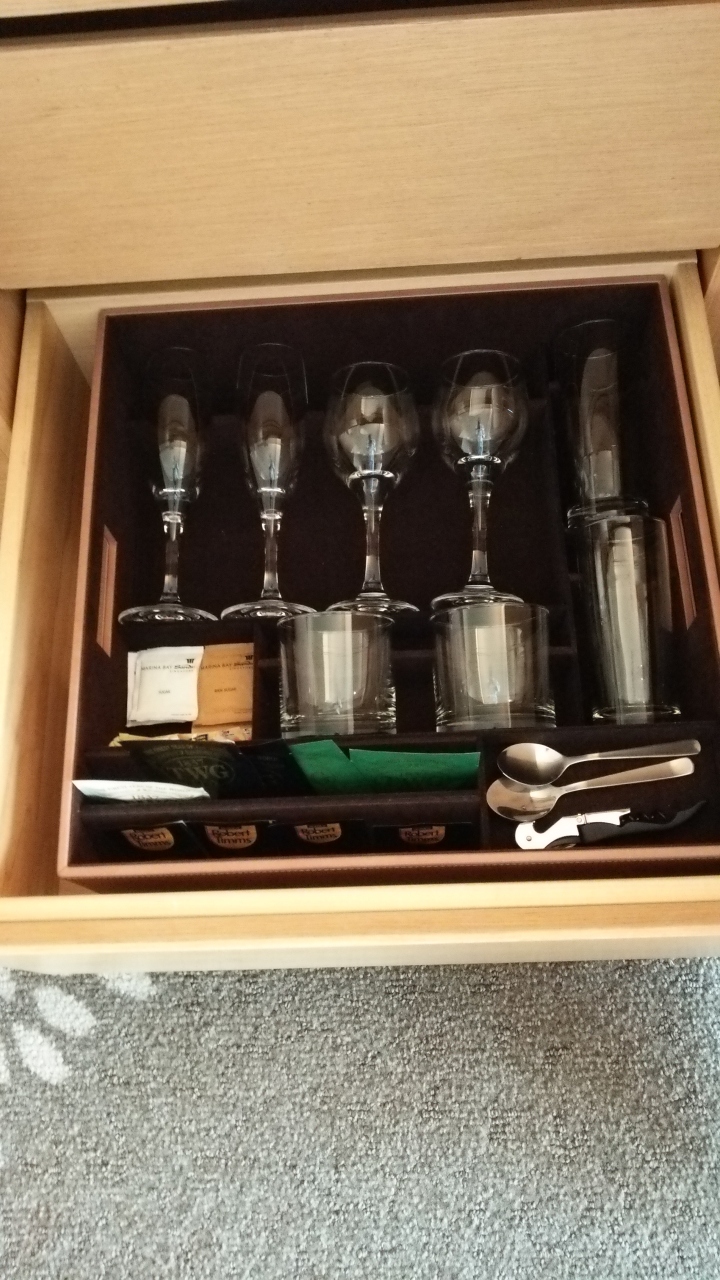 部屋は価格相応で広く快適。ミニバー用のグラスが完備(シャンパン用、ワイン用など)