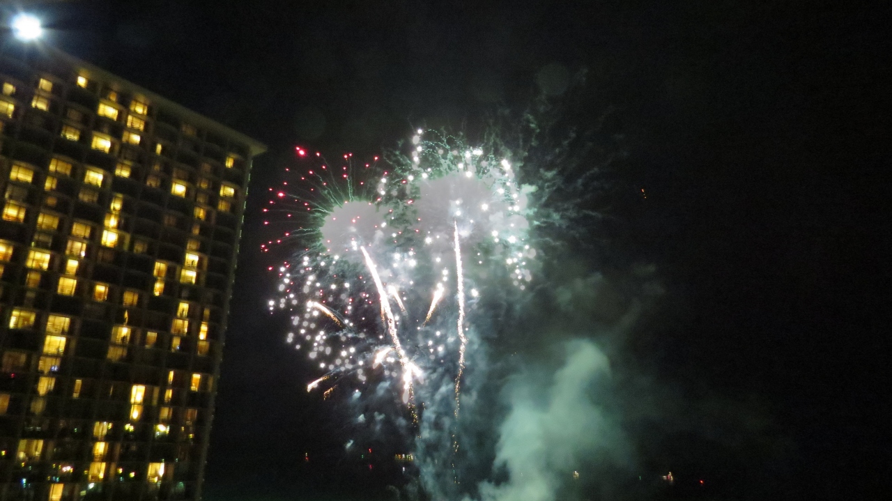 階数では,タワーの中間になります。夜,簡単な食事を用意して,花火が始まるちょっと前からラナイ(ベランダのこと)で食事開始。ヒルトンのラグーンの近くの駐車場には続々と車が集まってきました。夜7時45分いよいよ花火の打ち上げが始まり,打ち上げ時の音の空気の振動で駐車中の車のセキュリティーが反応して,あちこちで別の音も鳴り出す始末。