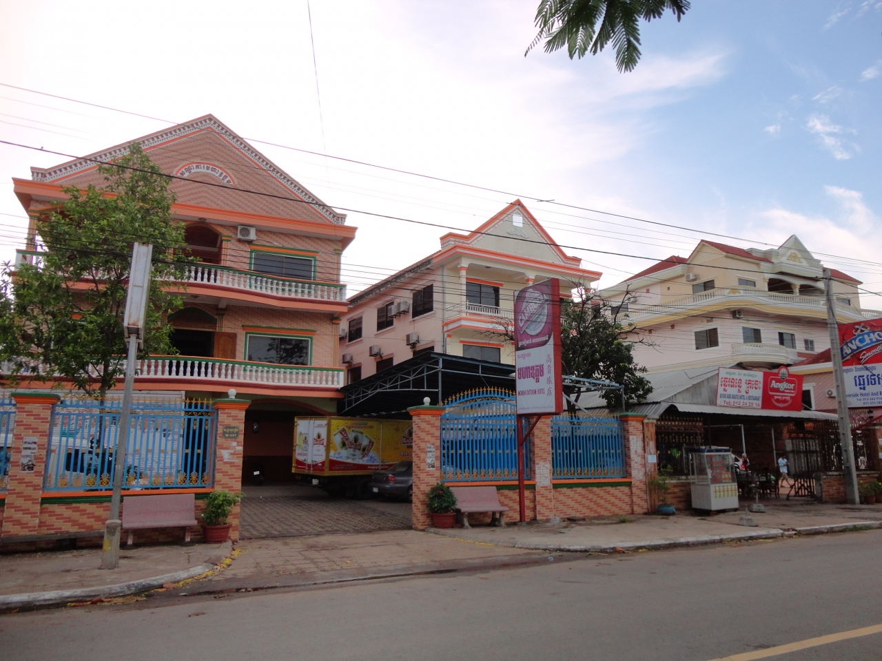 当日の夕食を取った『リバーサイドホテル』は7ドルの部屋があると言ってましたが、ホテルのレベルは少し下の感じ、翌日食事をした『オウドン・サンバッスホテル』がこの並んだ3軒の中では一番きれいで立派そうでした。