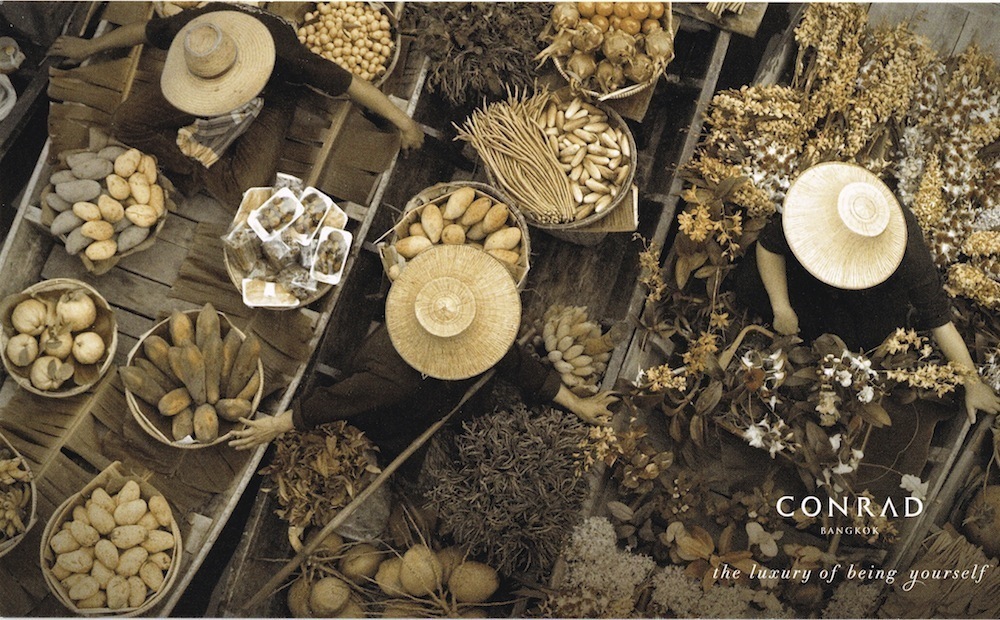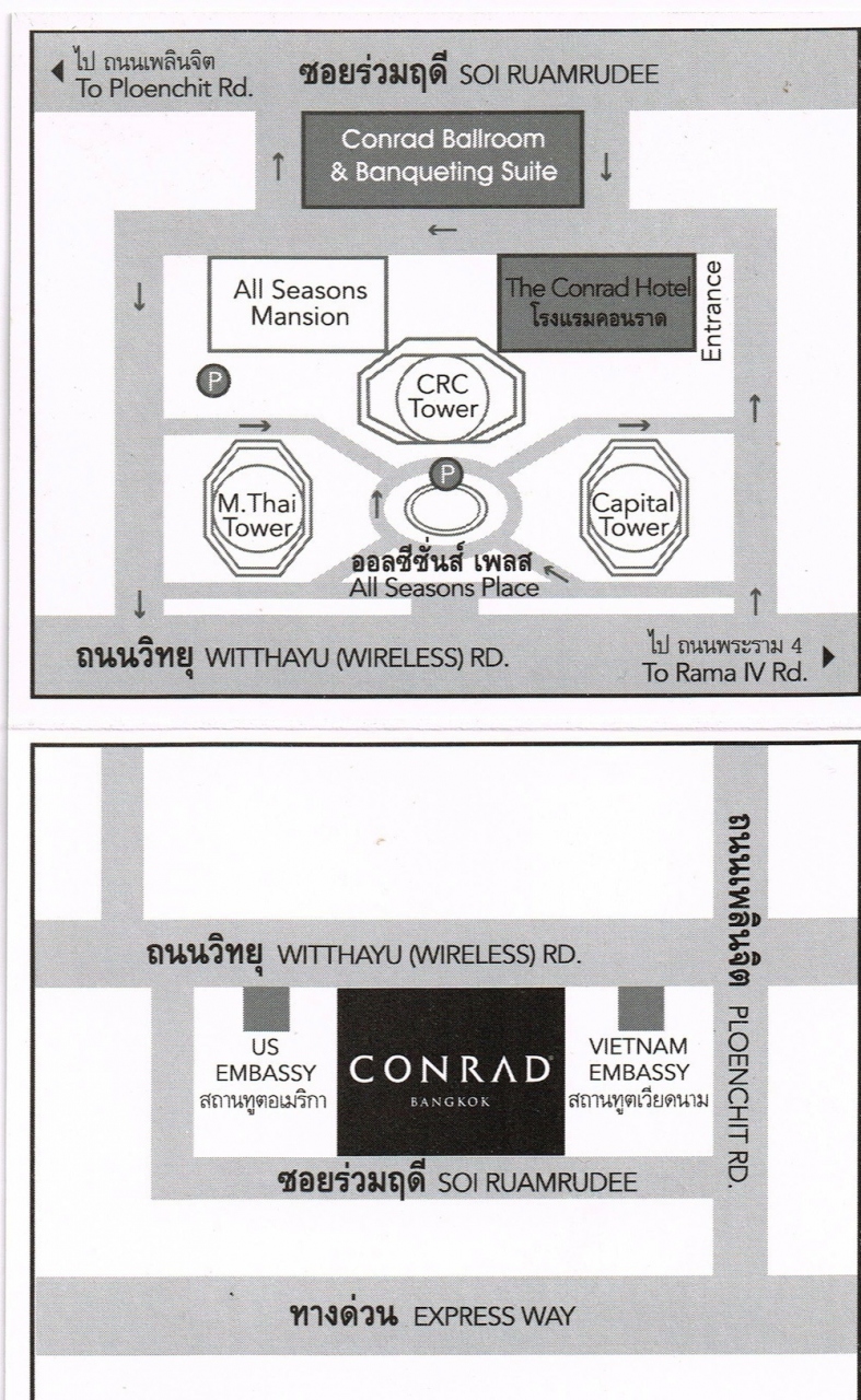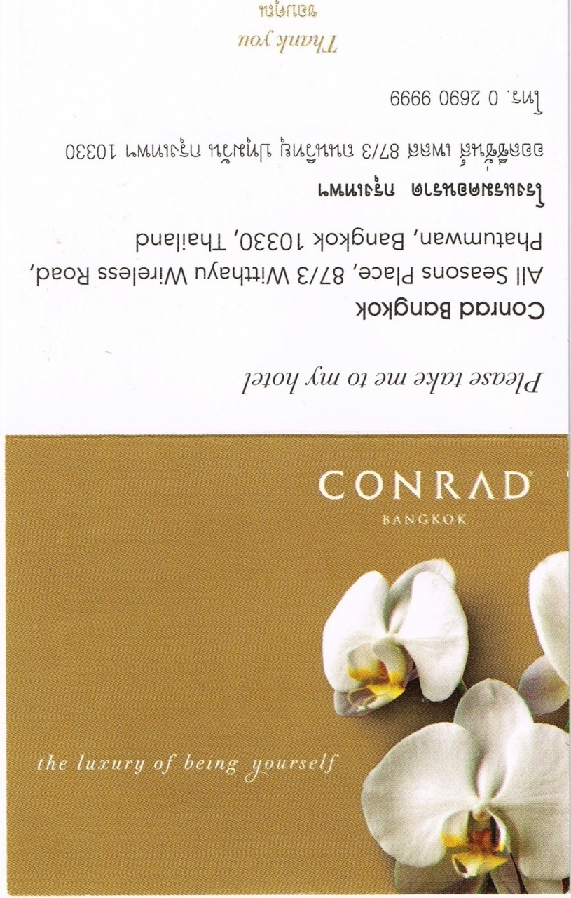 コンラッドはヒルトン系列ながら、ヒルトン本体よりもスマートな施設が多く間違いのないホテルチェーンのひとつ。ホテル銀座のバンコクではその存在がやや埋もれていますが、ここは穴場。食事もインターナショナル・スタイルながら色々出ていて美味しいのにたいていのプランに食事がついています。また、客室も大きいので便利。タイ語ができないひとはタクシーの運転手との意思の疎通には写真に上げたネームカードを使うのが便利。