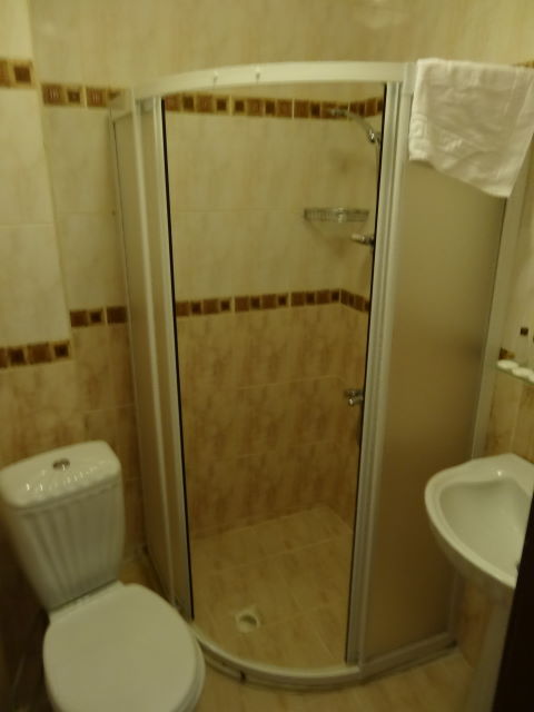 客室はダブルベッドにシャワールームと個別のトイレ付き。